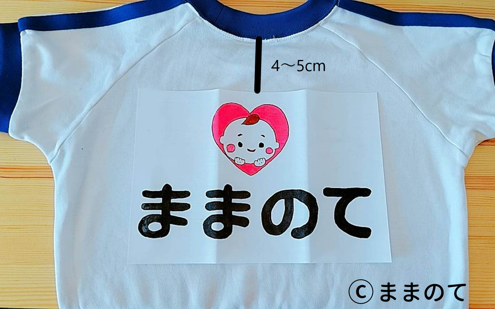 ゼッケンを体操服の背中がわに縫う場合、子どもの服のサイズにもよりますが襟首のところから4~5cmあけたところに合わせるとちょうど良い位置になります。子どもが体操服を着た際に、襟首からだいたい何cm下に縫えば良いか測っておいても良いですね。