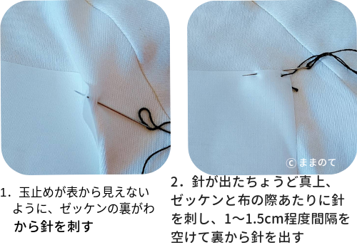 2.針が出たちょうど真上、ゼッケンと布の際(きわ)あたりに針を刺し、1~1.5cm程度間隔を空けて裏から針を出す