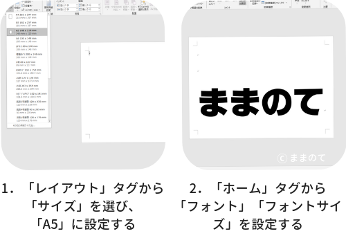 1.「レイアウト」タブから「サイズ」を選び、「A5」に設定する