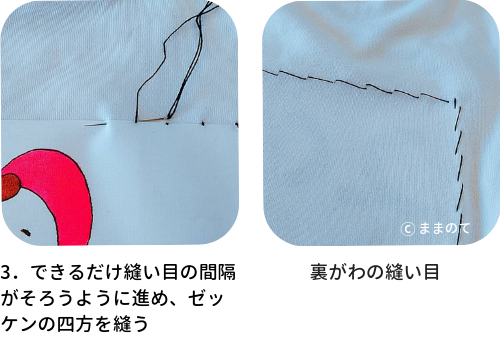 3.できるだけ縫い目の間隔がそろうように進め、ゼッケンの四方を縫う