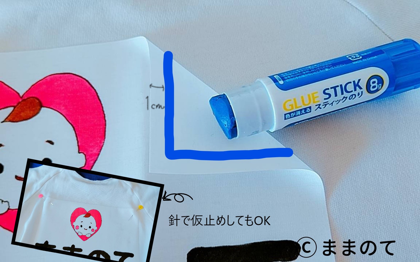 スティックのりを使って仮止めする場合、端から1cm程度あけたところにのりを塗ります。針を使わず仮止めできるので、安全に作業を進めることができるでしょう。