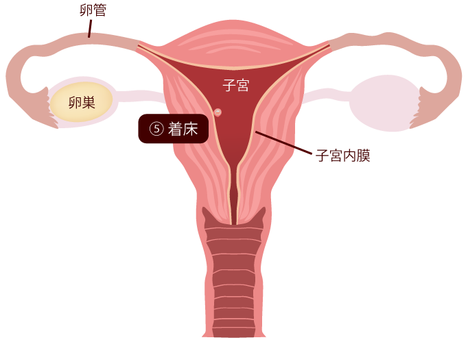 子宮内では、女性ホルモンの働きによって、排卵前から徐々に子宮内膜が厚くふかふかになっています。受精卵は子宮内にたどり着くと、タイミングを見計らい、このふかふかになった子宮内膜にもぐりこみ根をはります。これが「着床」です。着床すると、妊娠が成立したと言えます。なお、妊娠周期は最終生理開始日を0日として数えるため、妊娠が成立したタイミングが妊娠2~3週ということになります。