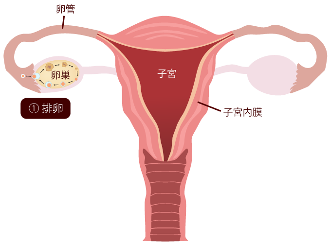 排卵は女性の生理(月経)周期にあわせておこります。一般的に女性の身体は、生理(月経)開始日の14日前に排卵をします。女性の身体は排卵・受精に向けて子宮内膜が厚くなり、妊娠が成立しなければ、子宮内膜が剥がれ落ちることで生理(月経)がおこります。生理が始まると、女性の身体は次の排卵に向けて準備をします。