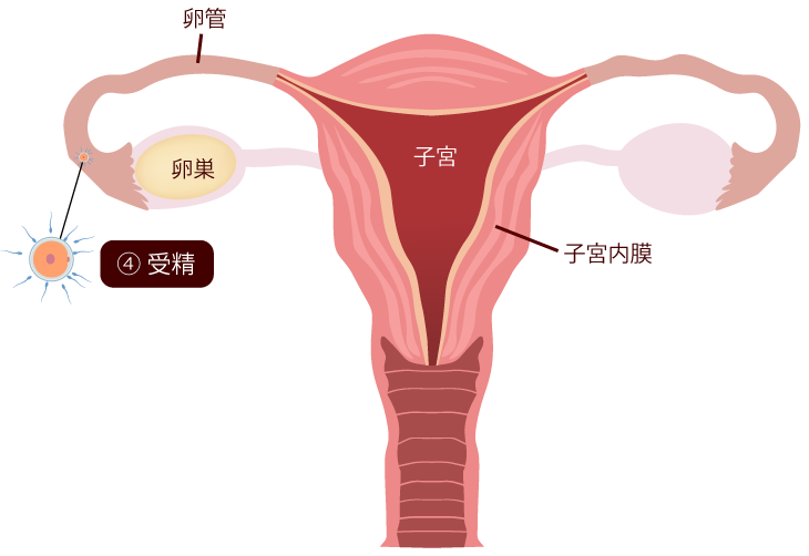 排卵した卵子は精子と出会うために卵管に移動し、女性の腟内に射精された精子は、卵子と出会うために卵管をめざして子宮内を進みます。卵管の中で卵子と精子がタイミングよく結びつき融合することを「受精」といいます。
