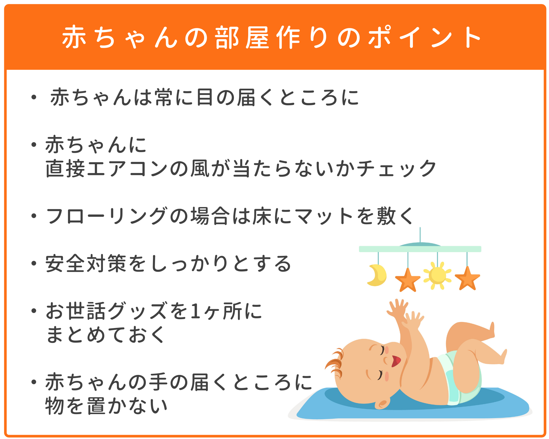 赤ちゃんが過ごす部屋は、赤ちゃんにとって快適な環境を整えてあげたいものですよね。赤ちゃんを迎える部屋のレイアウトで配慮するべきポイントは下記の通りです。