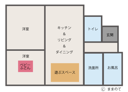 普段はキッチンからも目が届くよう、リビングにマットを敷いて遊ばせていました。お昼寝の時間になると、リビングの隣の部屋に布団を敷き、そこに娘を寝かせていました。キッチンからは見えませんが、ドアを開けていたため、目を覚ますとすぐに気が付き安心でした。