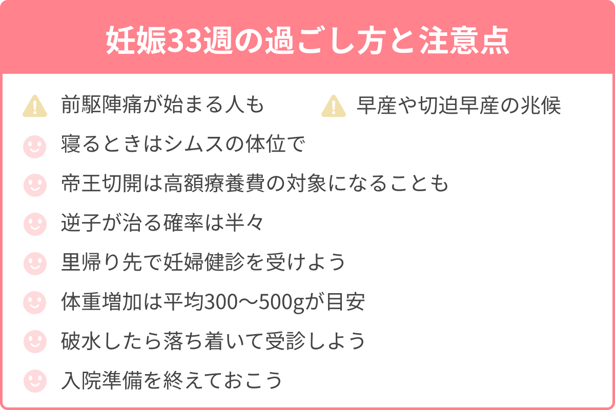 【医師監修】妊娠33週(33w)は妊娠9ヶ月の2週目。妊娠後期に入り出産予定日が近づいてきました。胎児の体重が増えて羊水量がピークとなり子宮底はみぞおち付近まで上がるため、動悸や息切れ、お腹の張りが気になる時期。赤ちゃんの発達とママの症状、体重管理や運動など生活の注意点、逆子や早産・前駆陣痛・破水について解説します。