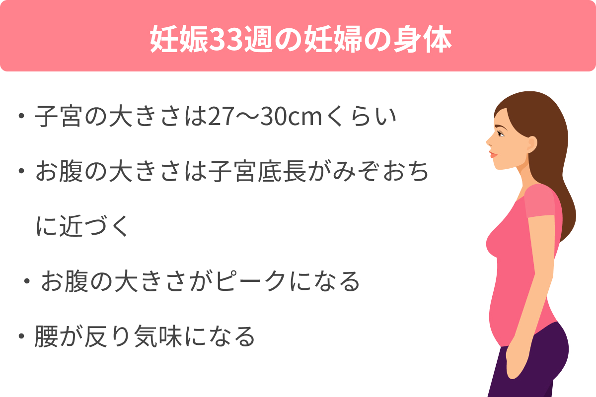 妊娠33週は子宮底がみぞおちあたりまで届きます。妊娠10ヶ月になるとお腹が下がるので、外見では一番お腹が大きく見える時期です。お腹が大きく前にせり出すため、腰は反り気味になります。