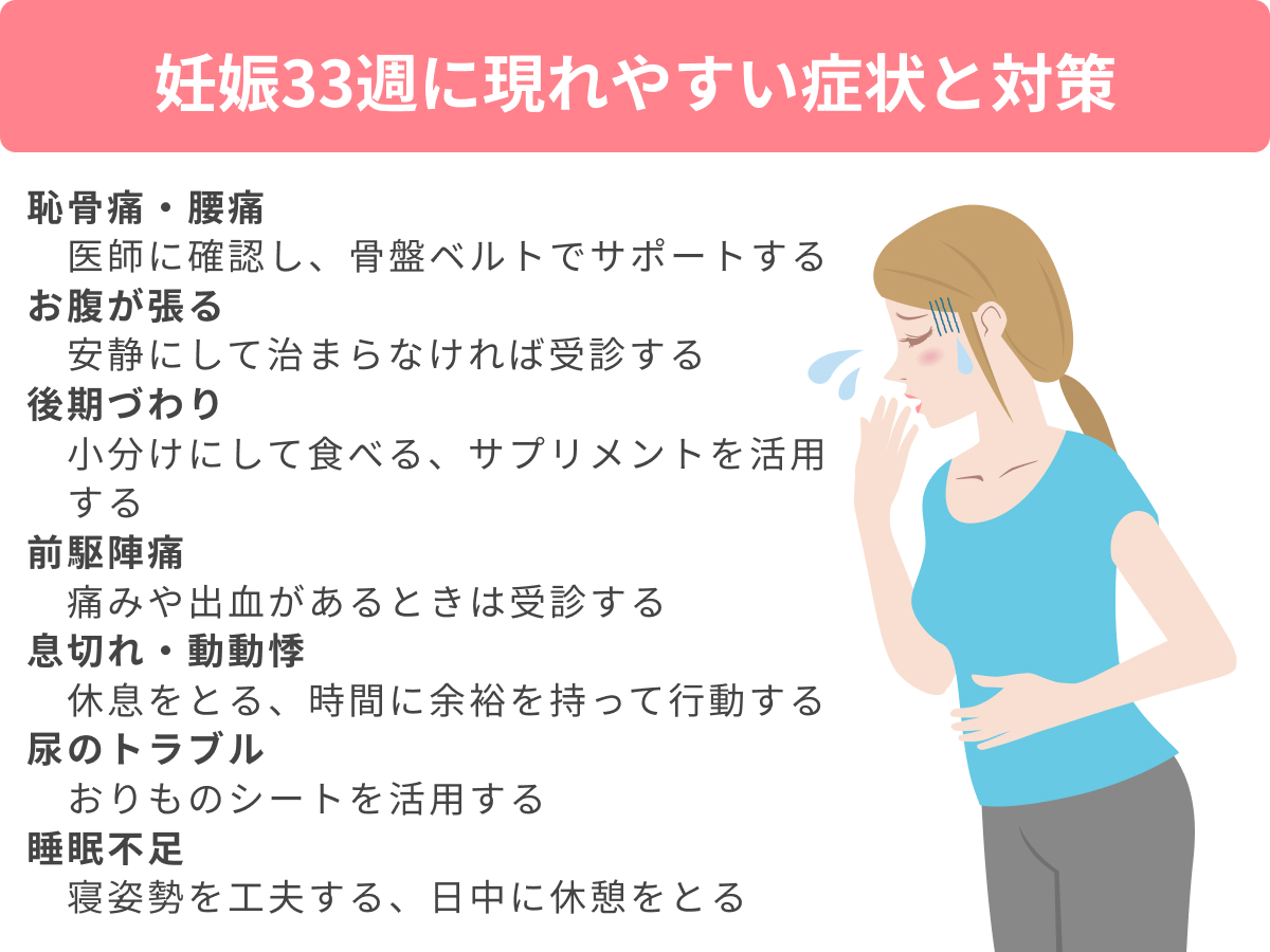 妊娠33週にあらわれやすい症状 お腹が張る、前駆陣痛、腰痛…