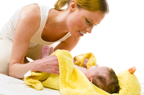 手早く赤ちゃんを洗い、用意していたバスタオルで包む