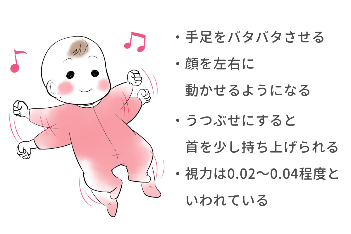 首はまだ完全にすわらないものの、生後1ヶ月後半にはうつぶせの状態で首を少し持ち上げるようになることが一般的です。生後1ヶ月の視力はまだ0.02~0.04程度だといわれていますが、急速に発達し、生後3ヶ月頃までには物を見つめたり物の動きを追えるようになったりします。