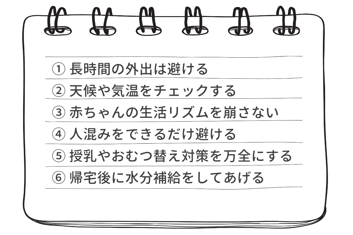 赤ちゃんが外の空気に慣れてきたら、少しずつおでかけをスタートしても良いですね。上記のポイントを参考に、赤ちゃんに負担がかからない短時間のおでかけから始めてみましょう。