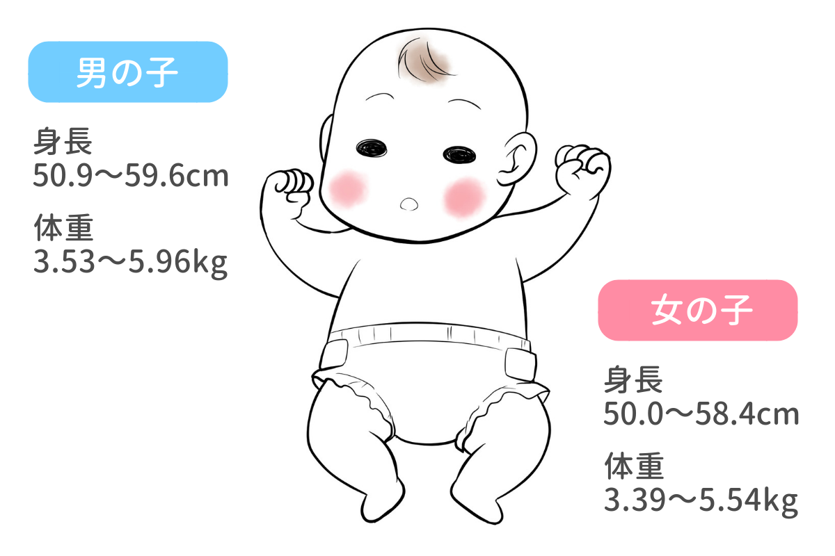 生後1ヶ月といっても、生後1ヶ月0日と生後1ヶ月30日では身長も体重も大きく変わります。1ヶ月半頃の体重・身長などおおよその目安を知りたいときは、母子手帳などに掲載されている身体発育曲線が役立ちます。