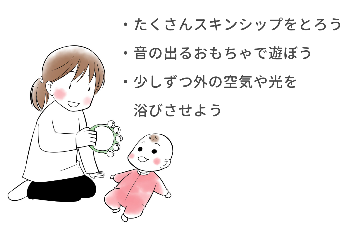 赤ちゃんが起きているあいだは、赤ちゃんの身体にたくさん触れましょう。スキンシップは赤ちゃんの五感を発達させることに効果的です。この時期はガラガラのような音の出るおもちゃや、メリーのような動くおもちゃがおすすめです。赤ちゃんがおもちゃを目で追うことは、視力の発達にもつながります。