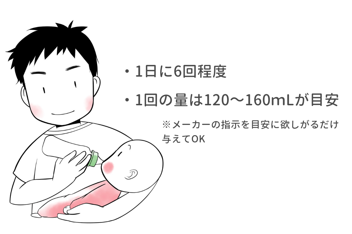 ミルクのみで赤ちゃんを育てる場合には、1回120~160mLのミルクを1日6回程度与えるのが目安です。メーカーによって目安は異なるため、ミルクのパッケージに記載されているメーカーの指示を参考にしてくださいね。ミルクの場合にも、メーカーの指示を目安にしつつ、赤ちゃんの欲しがるだけ与えて構いません。