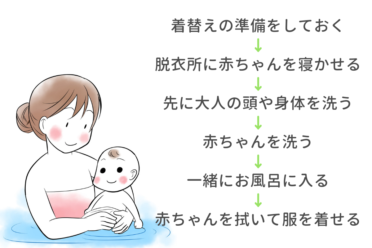 1ヶ月健診でママに問題がなければ、赤ちゃんと一緒に大人のお風呂に入るようになる赤ちゃんが多いようです。赤ちゃんと一緒にお風呂に入る一般的な手順は上記の通りです。