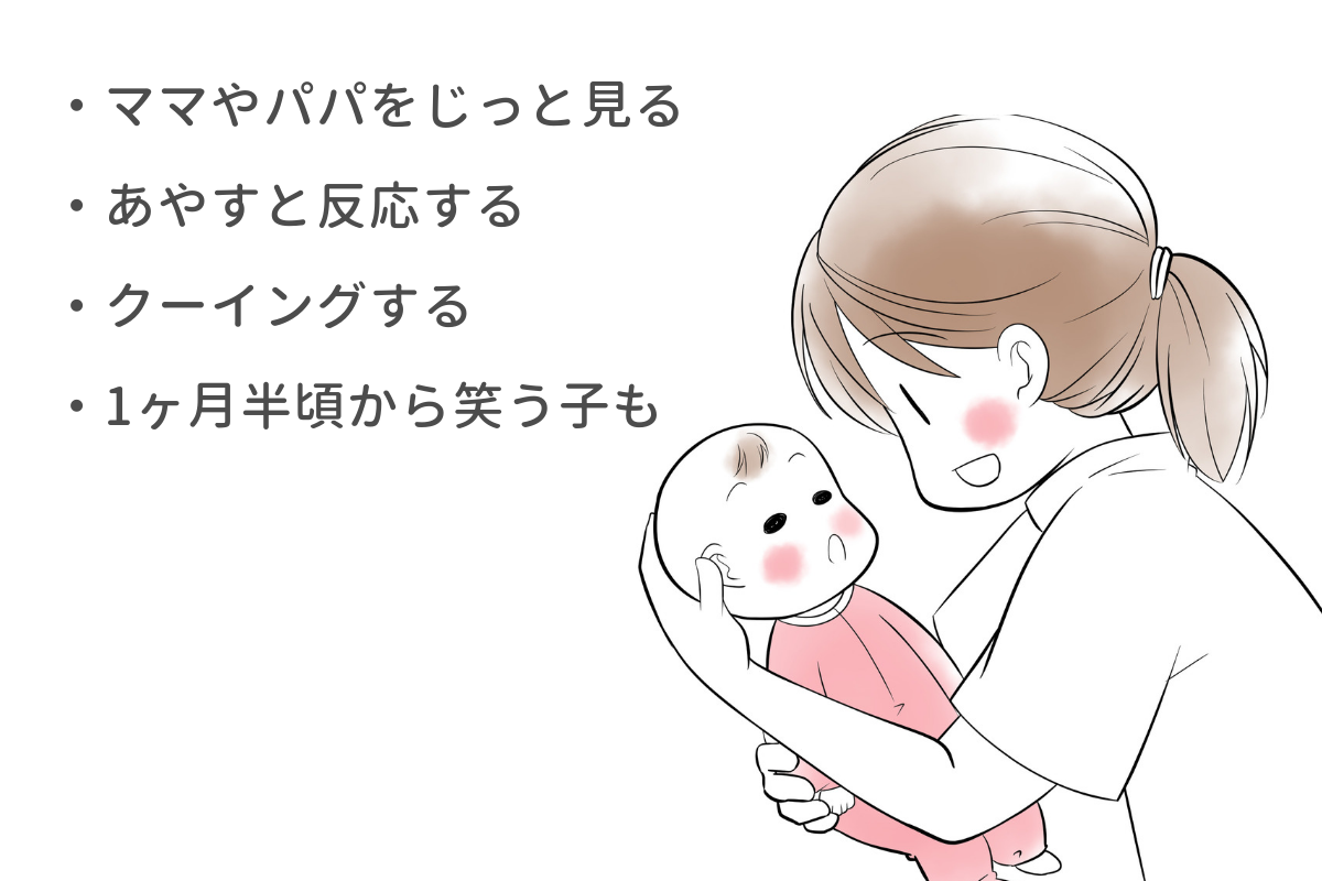 赤ちゃんは生後1ヶ月になると自分の周囲の人を認識するようになります。抱っこするとママやパパをじっと見る姿が見られますよ。あやすと反応するようになるのも生後1ヶ月を過ぎた頃からです。早い子では生後1ヶ月半頃から、自分で泣き声ではない声を発するようになったり(クーイング)、ニコッとほほえむようになったりしますよ。