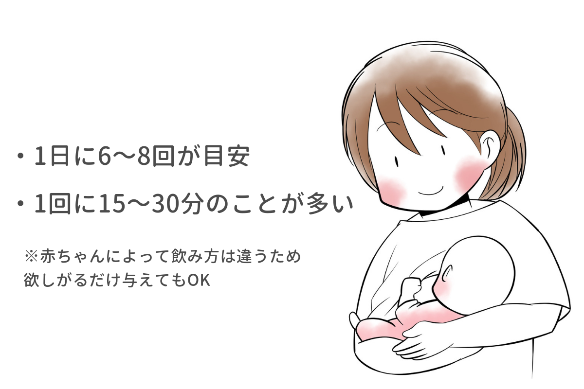 生後1ヶ月の赤ちゃんを母乳のみで育てる場合、3~4時間おきに6~8回授乳をするように指導されることが多いようです。しかし、赤ちゃんによって一度に飲める量は違います。1日に10回以上の頻回授乳を続けている赤ちゃんも少なくありません。