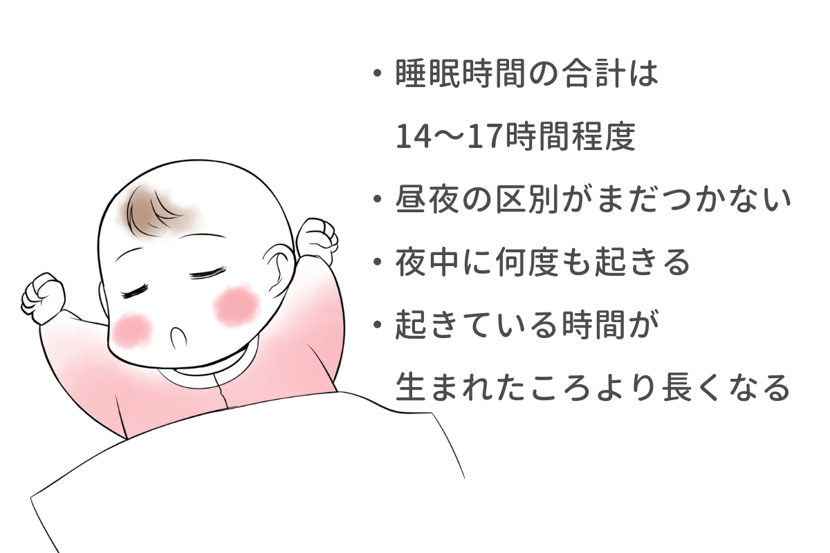 米国の国立睡眠財団(NATIONAL SLEEP FOUNDATION)によると、生後1ヶ月の赤ちゃんが必要とする睡眠時間は14~17時間程度です。昼間に起きている時間が少しずつ長くなりますが、睡眠リズムには個人差があります。
