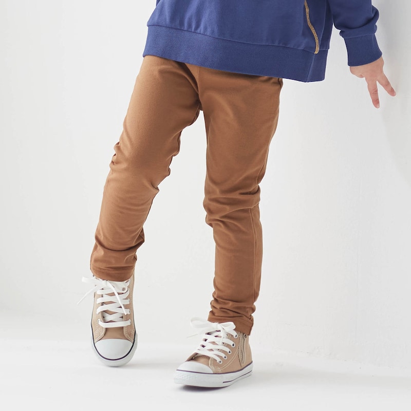 前後の区別がなく、どちら向きでも履ける「履き間違いがない」パンツです。レギンスとしてもパンツとしても使えるシルエットで、1枚で2役をこなします。生地は伸縮性があり汚れにも強いので、毎日の通園に活躍します。