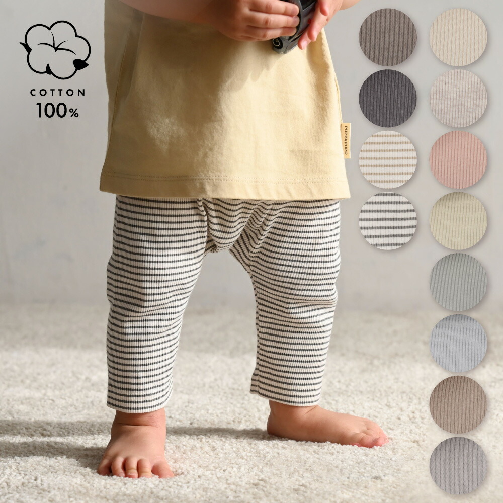 肌触りの良い綿100%のレギンスパンツです。おむつをはいても窮屈にならない、お尻に余裕を持たせたデザインがポイントです。活発に動き回るハイハイ期の赤ちゃんにぴったりですよ。12色から選べます。