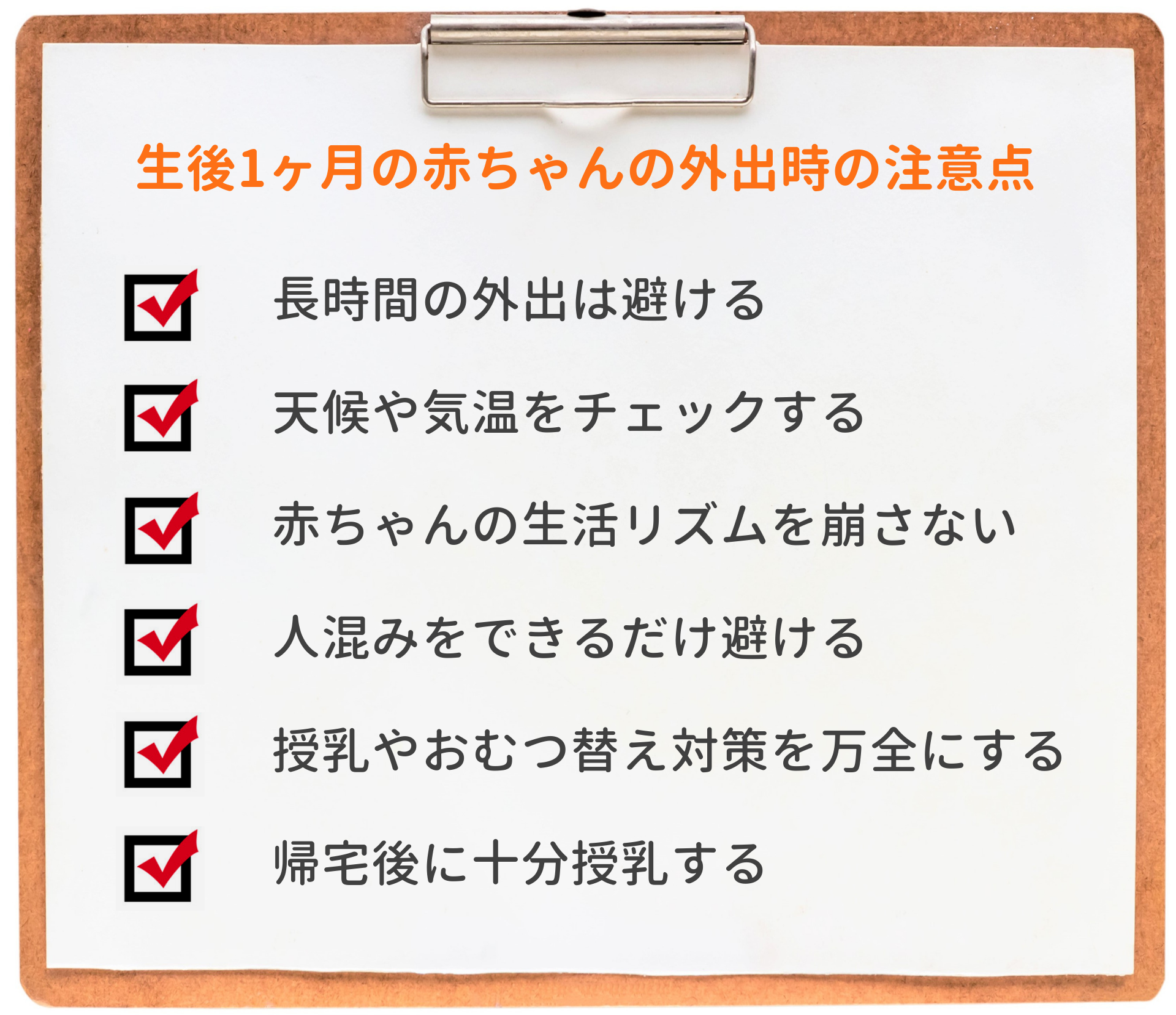 生後1ヶ月になると、個人差がありますが少しずつ授乳や睡眠のリズムができてくる赤ちゃんもいるかもしれません。赤ちゃんが普段と同じリズムで過ごせるように外出時間を調整すると、お世話をするママやパパも楽ですよ。